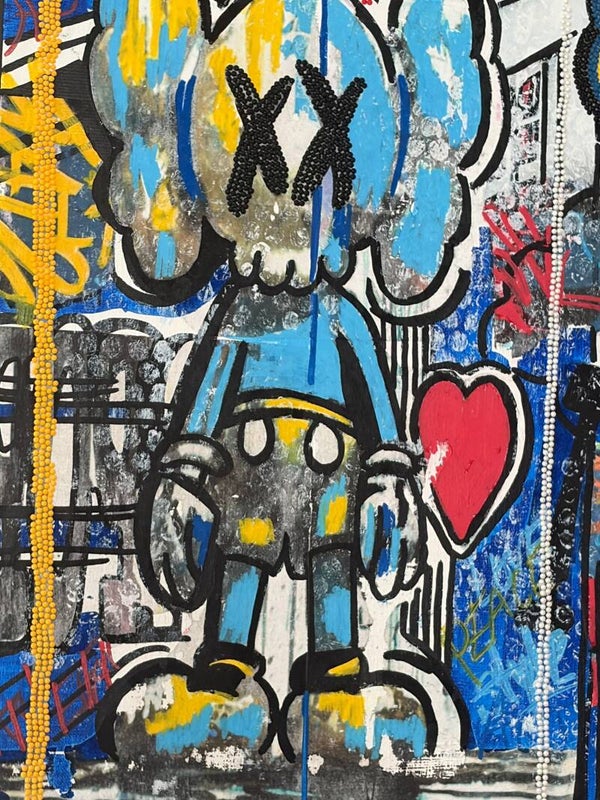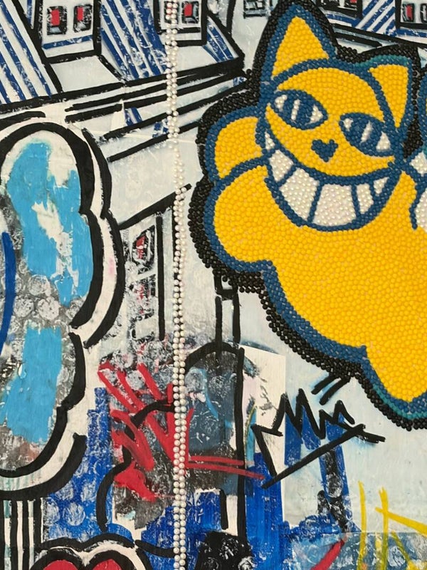 Pièce unique réalisée à la main sur toile coton, dans un univers urbain fort mêlant pop culture et street art.