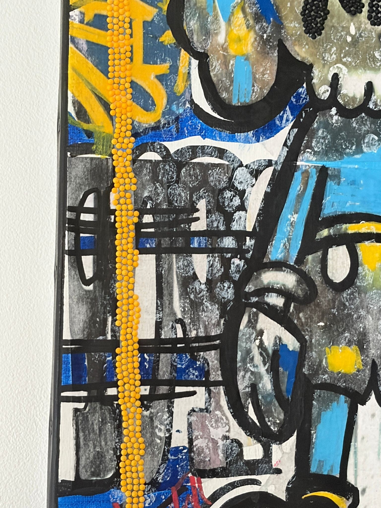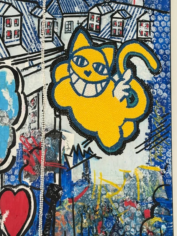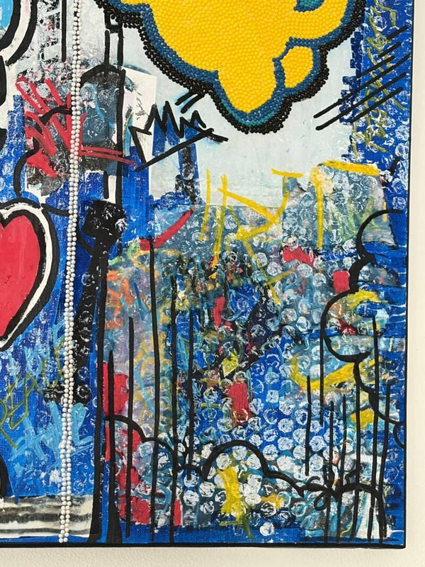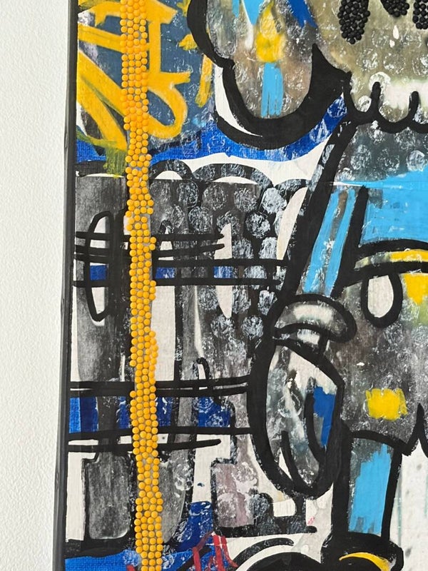 💙 Composition dynamique et très texturée, avec un vrai travail de matière (relief, superpositions, détails en diamond painting) qui donne une présence visuelle forte à l’œuvre.